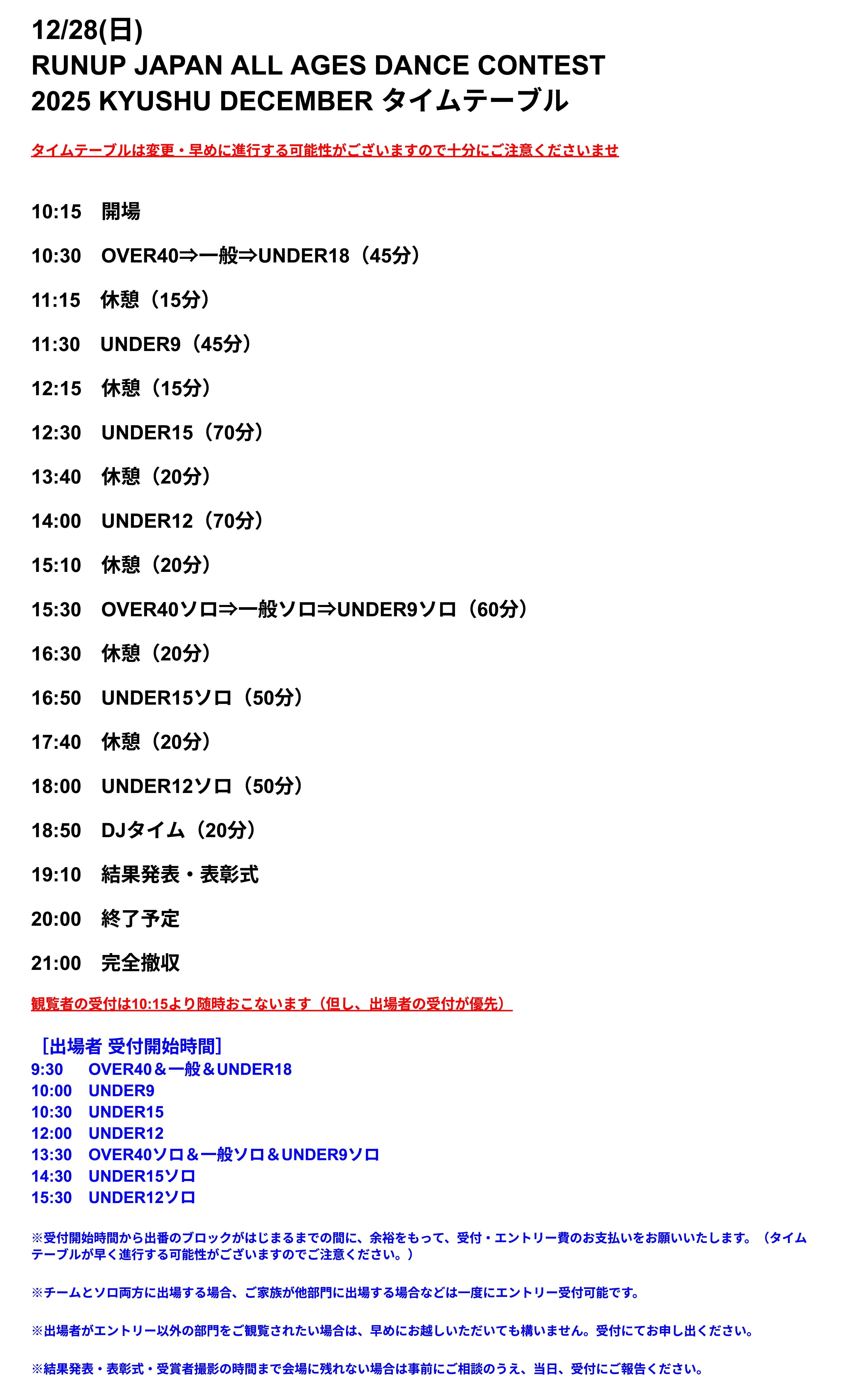 エントリー費もしくは観覧費をお支払いいただけない場合、建物に入ることは一切できません。(練習スペース、荷物置き場を含む)ご協力と、ルールの順守をお願いいたします。また、振付師・指導者の無料招待枠を不正に使用したことが発覚した場合(親御様がその枠を使い無料で入場するなど)は、該当チームを失格とさせていただき、以後、出入禁止とさせていただきます