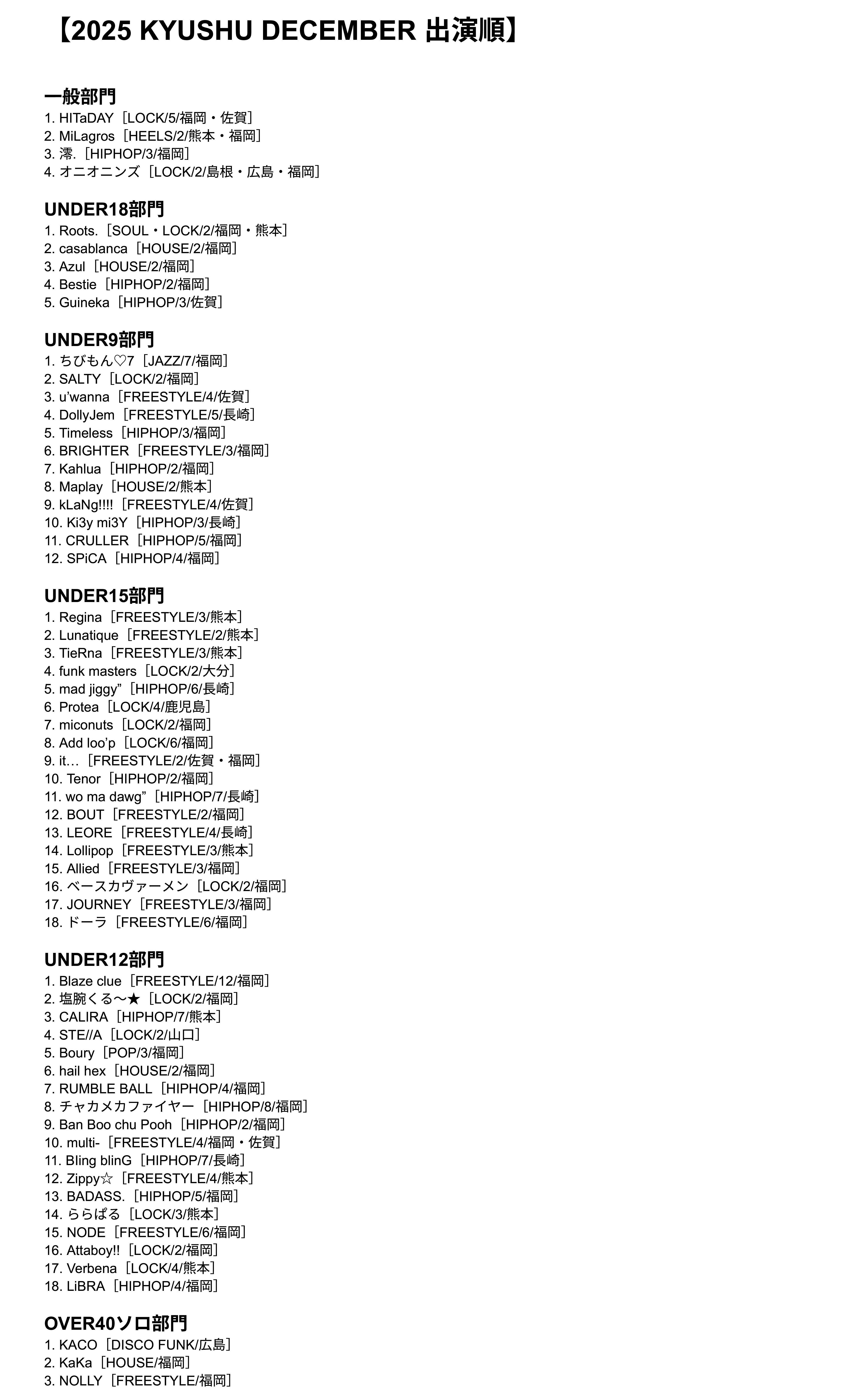 エントリーの早い順に最後からの出演順とします。(エントリーの1番早いチーム/ダンサーが最後、エントリーの1番遅いチーム/ダンサーが最初となる出演順)