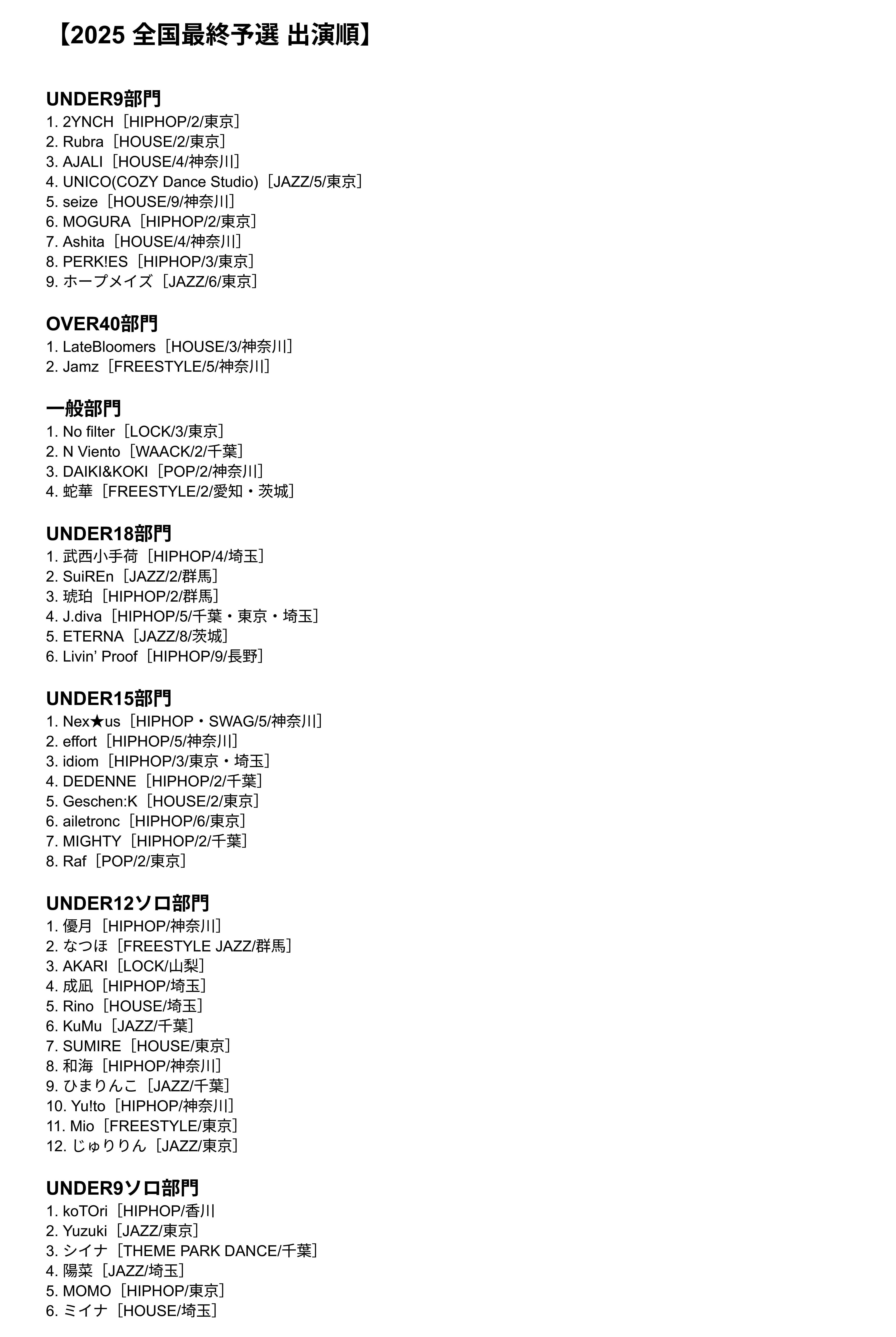 エントリーの早い順に最後からの出演順とします。(エントリーの1番早いチーム/ダンサーが最後、エントリーの1番遅いチーム/ダンサーが最初となる出演順)